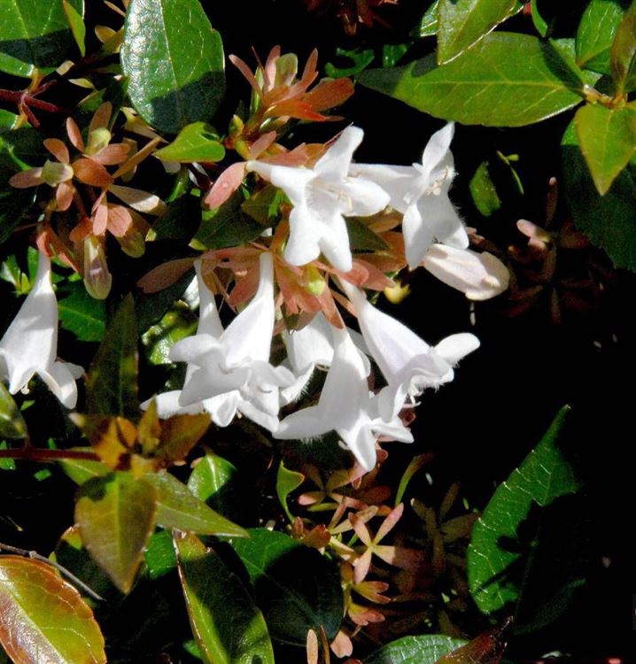 Als Ziergehölz macht die Grossblütige Abelie (Abelia grandiflora) immer eine gute Figur in der Gartengestaltung, aber auch eine Pflanzung in Kübeln auf Balkon oder Terrasse ist möglich. Ihre lanzettlichen Blätter machen sie unverwechselbar. Sie sind schön dunkelgrün gefärbt. Im Herbst nehmen die wintergrünen Blätter bronzefarbene Töne an. Ihre glockenförmigen Blüten, die sie von Juli bis Oktober trägt, sind hellrosa.