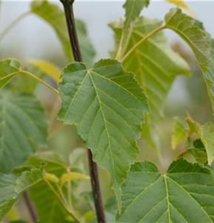 Nach einem Austrieb in Bronze nehmen die eiförmigen, gelappten Blätter eine mittelgrüne Farbe an. Dabei sind sie etwa 8 cm bis 15 cm gross. Vor dem Laubfall nehmen sie schöne gelb-rote Farbtöne an.