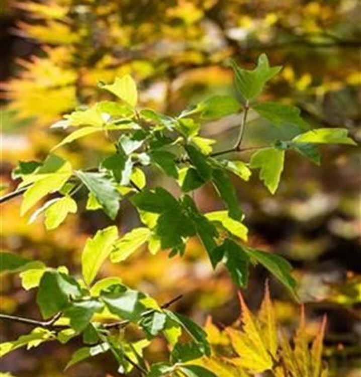 Im Einzelstand ist der Zimt-Ahorn (Acer griseum) eine prächtige Erscheinung. Seine dreizähligen, schwach gelappten Blätter machen ihn unverwechselbar. Sie sind, nach einem bernsteingelben Austrieb, schön dunkelgrün gefärbt. Im Herbst nehmen die sommergrünen Blätter scharlachrote Töne an. Seine Blüten, die er im Mai trägt, sind hellgelb. Er trägt rot-braune Flügelfrüchte.