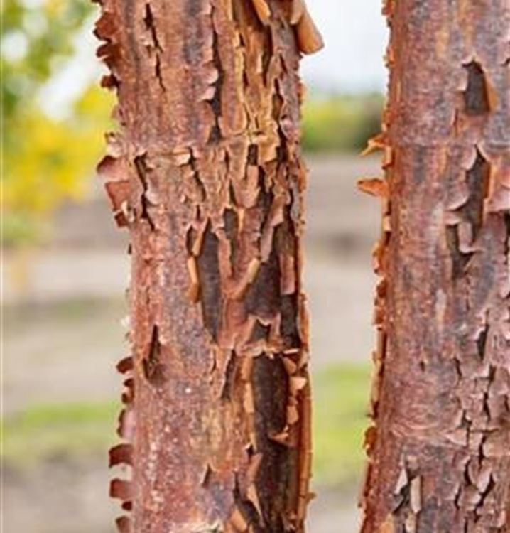 Mit abrollender Struktur und brauner Farbe trägt sie zum Charakter des Zimt-Ahorn bei.