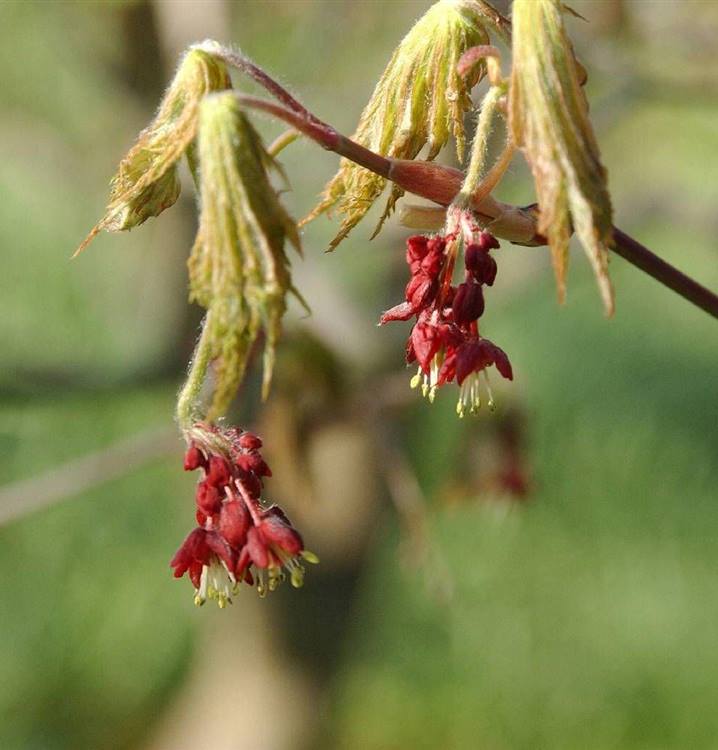 Die Blütezeit beginnt für den Japanischen Feuerahorn 'Aconitifolium' ab April. Dann trägt er Trauben mit, purpurroten Blüten. Bis Mai hält die Blüte an.