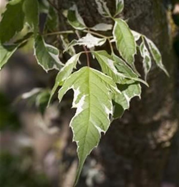 Im Einzelstand ist der Silberbunte Eschenahorn 'Variegatum' (Acer negundo 'Variegatum') eine prächtige Erscheinung. Seine gefiederten Blätter machen ihn unverwechselbar. Sie sind, nach einem rosafarbenen Austrieb, schön grün-weiss gefärbt.