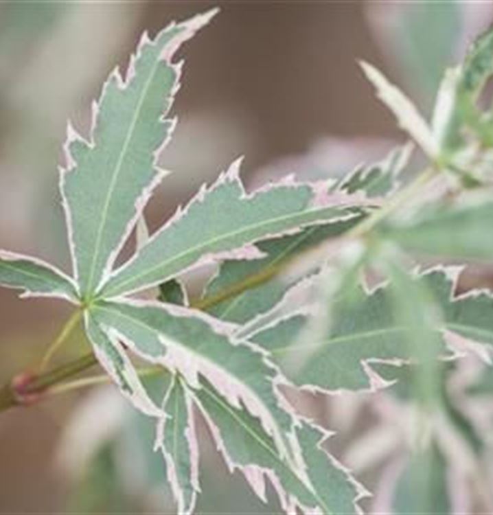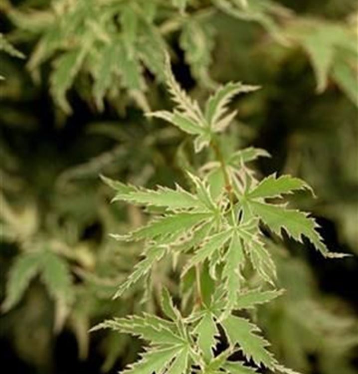 Der Fächerahorn 'Butterfly' (Acer palmatum 'Butterfly') ist ein Ziergehölz, das als Solitär eine besondere Wirkung erzielt. Seine geschnittenen, gelappten Blätter machen ihn unverwechselbar. Sie sind schön grün-weiss gefärbt. Im Herbst nehmen die sommergrünen Blätter scharlachrote Töne an.