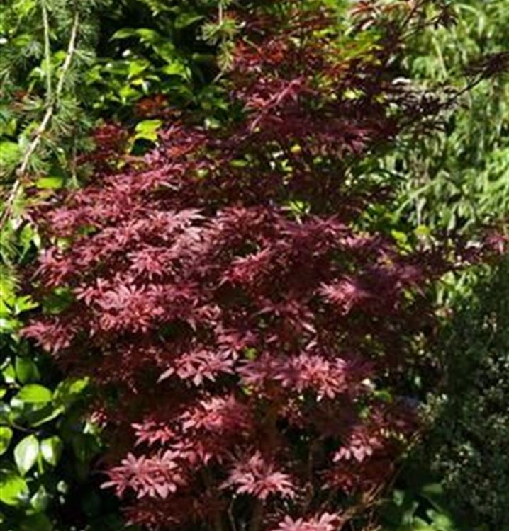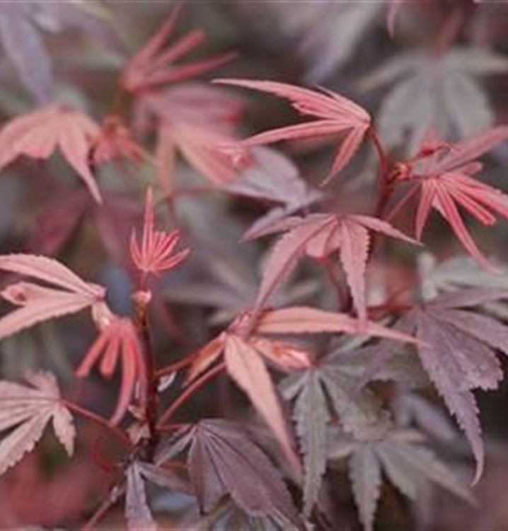 Der Fächerahorn 'Shaina' (Acer palmatum 'Shaina') ist ein wunderbares, interessantes Gehölz. Seine geschnittenen, gelappten Blätter machen ihn unverwechselbar. Sie sind schön dunkelrot gefärbt. Im Herbst nehmen die sommergrünen Blätter orange-rote Töne an. Seine Blüten, die er im Mai trägt, sind purpurrot. Er trägt rot-braune Flügelfrüchte.