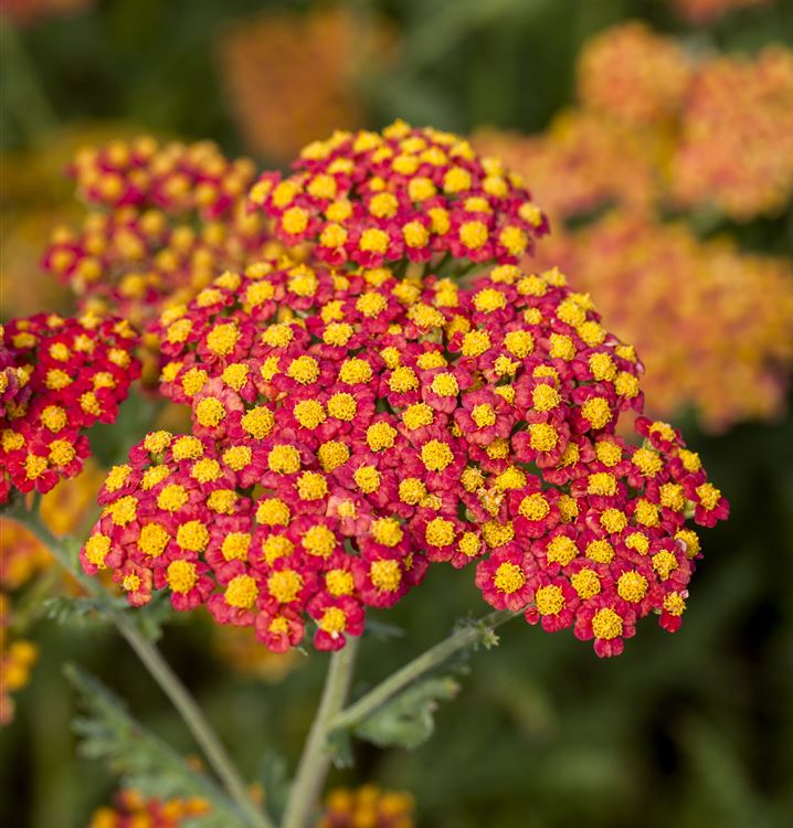 Die Blütezeit beginnt für die Schafgarbe 'Walter Funcke' ab Juni. Dann trägt sie Dolden mit, orange-roten Blüten. Noch dazu verströmen sie einen angenehmen Duft. Bis Juli hält die Blüte an und mit den richtigen Bedingungen ist im September mit einer zweiten Blüte zu rechnen.