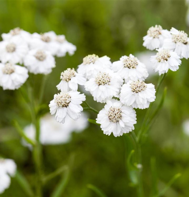 Stauden sind in der Gartengestaltung fast ein Muss, gibt es doch für nahezu jeden Standort die passenden Pflanzen. Mit ihren ballförmigen, gefüllten Blüten in Weiss ist die Garten-Bertrams-Garbe 'The Pearl' von Juni bis September ein Blickfang. Dabei ist sie nicht nur eine Augenweide, denn ihre Blüten werden auch gerne von Bienen und anderen Insekten angeflogen. Ihre lanzettlichen Blätter tragen ebenso zu ihrer Wirkung bei. Sie sind dunkelgrün gefärbten.