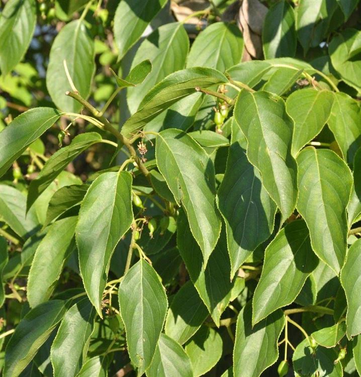 Die eiförmigen, gesägten Blätter haben eine dunkelgrüne Farbe. Dabei sind sie etwa 8 cm bis 12 cm gross. Vor dem Laubfall nehmen sie schöne gelbe Farbtöne an.