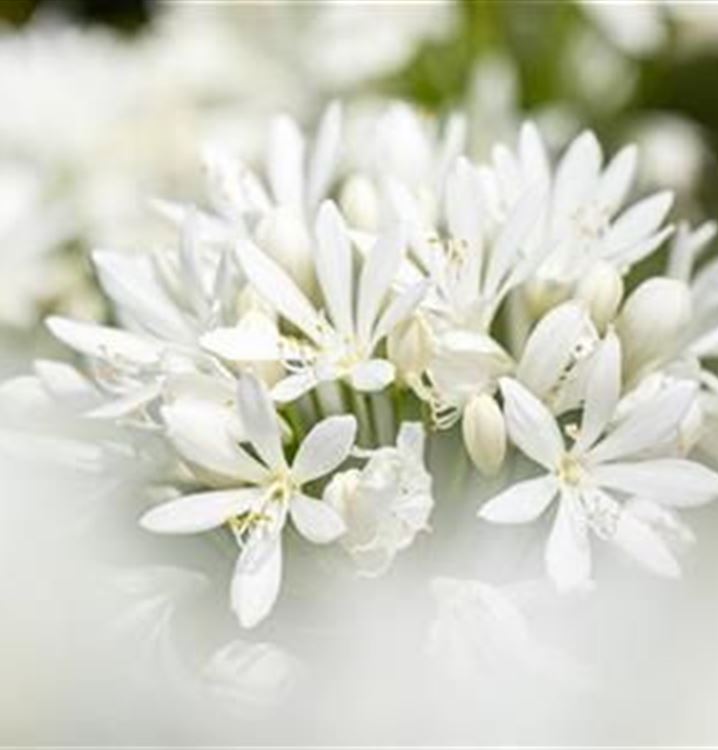 Die Blütezeit beginnt für die Garten-Schmucklilie 'Albus' ab Juli. Dann trägt sie Ähren mit sternförmigen, weissen Blüten. Bis September hält die Blüte an.
