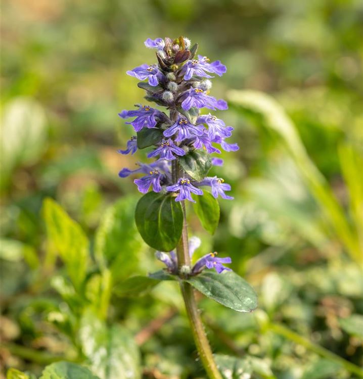 Stauden sind in der Gartengestaltung fast ein Muss, gibt es doch für nahezu jeden Standort die passenden Pflanzen. Der Kriechende Günsel (Ajuga reptans) ist zum Beispiel ein hervorragender Bodendecker. Mit seinen lippenförmigen Blüten in Blau ist der Kriechende Günsel von April bis Mai ein Blickfang. Dabei ist er nicht nur eine Augenweide, denn seine Blüten werden auch gerne von Bienen und anderen Insekten angeflogen. Seine glänzenden, eiförmigen, ganzrandigen Blätter tragen ebenso zu seiner Wirkung bei. Sie sind dunkelgrün gefärbten. Da es sich um eine wintergrüne Staude handelt, sorgen die Blätter auch im Winter für farbliche Akzente.