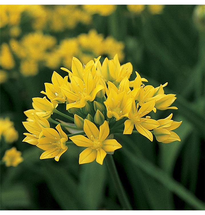 Der Gold-Lauch 'Jeannine' (Allium moly 'Jeannine') ist eine echte Bereicherung in der Gartengestaltung. Mit seinen sternförmigen Blüten in Goldgelb trägt der Gold-Lauch 'Jeannine' von Juni bis Juli auf seine Weise zur Gestaltung bei. Dabei ist er nicht nur eine Augenweide, denn er wird auch gerne von Bienen und anderen Insekten angeflogen. Als Grundlage dienen dabei seine lanzettlichen Blätter in Blau-grün.