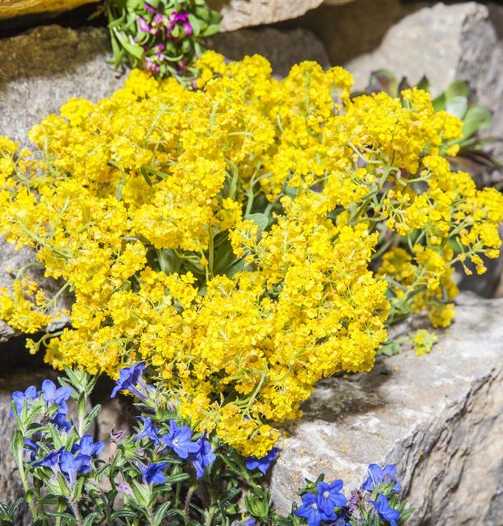 Pflanzenkombinationen machen sich immer besonders gut. Für die Nachbarschaft des Garten-Berg-Steinkraut 'Berggold' eignet sich zum Beispiel Garten-Blaukissen, Garten-Teppich-Flammenblume und Kaukasische Gänsekresse.