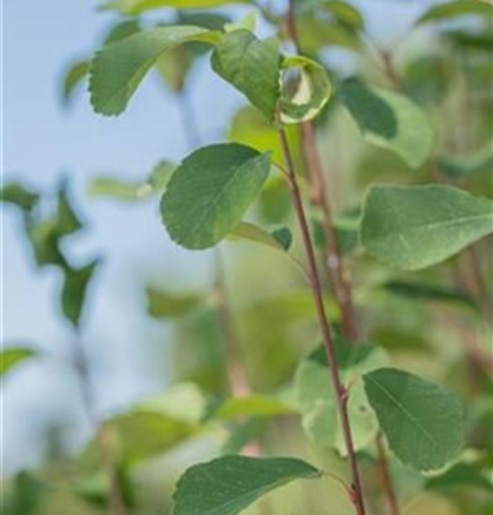 Nach einem Austrieb in Kupferbraun nehmen die eiförmigen Blätter eine mittelgrüne Farbe an. Vor dem Laubfall nehmen sie schöne gelb-rote Farbtöne an.