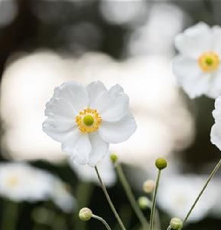 Die Garten-Herbst-Anemone 'Honorine Jobert' (Anemone japonica 'Honorine Jobert') ist eine echte Bereicherung in der Gartengestaltung und kann auch als Schnittpflanze in der Vase sehr dekorativ sein. Mit ihren schalenförmigen Blüten in Weiss trägt die Garten-Herbst-Anemone 'Honorine Jobert' von September bis Oktober auf ihre Weise zur Gestaltung bei. Dabei ist sie nicht nur eine Augenweide, denn sie wird auch gerne von Bienen und anderen Insekten angeflogen. Als Grundlage dienen dabei ihre gefiederten Blätter in Dunkelgrün.
