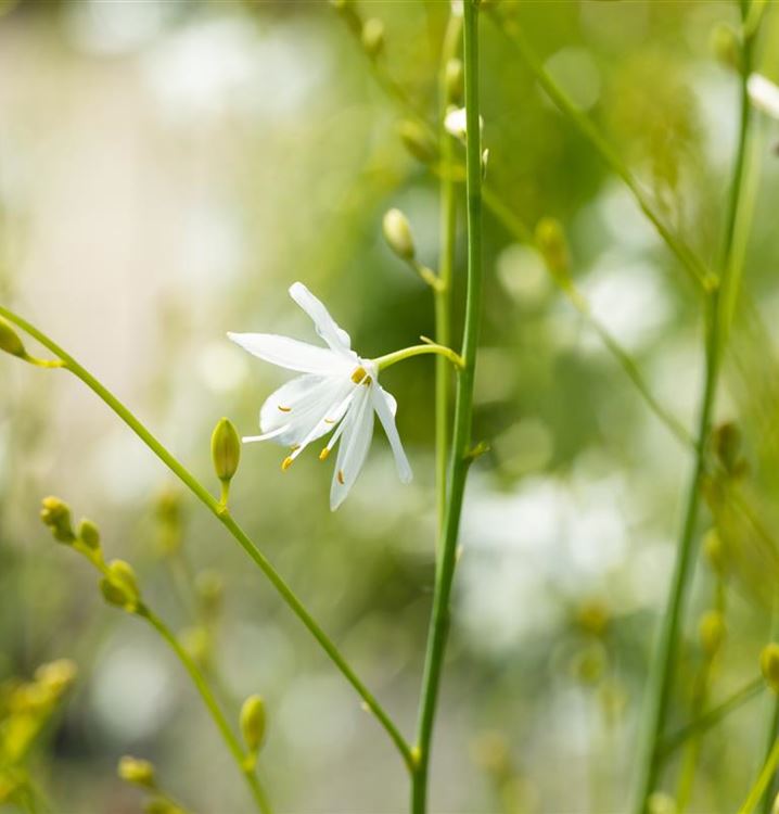 Stauden sind in der Gartengestaltung fast ein Muss, gibt es doch für nahezu jeden Standort die passenden Pflanzen. Die Ästige Graslilie (Anthericum ramosum) ist zum Beispiel eine hervorragende Steingartenpflanze. Mit ihren sternförmigen Blüten in Weiss ist die Ästige Graslilie von Juni bis August ein Blickfang. Dabei ist sie nicht nur eine Augenweide, denn ihre Blüten werden auch gerne von Bienen und anderen Insekten angeflogen. Ihre linealen Blätter tragen ebenso zu ihrer Wirkung bei. Sie sind mittelgrün gefärbten.