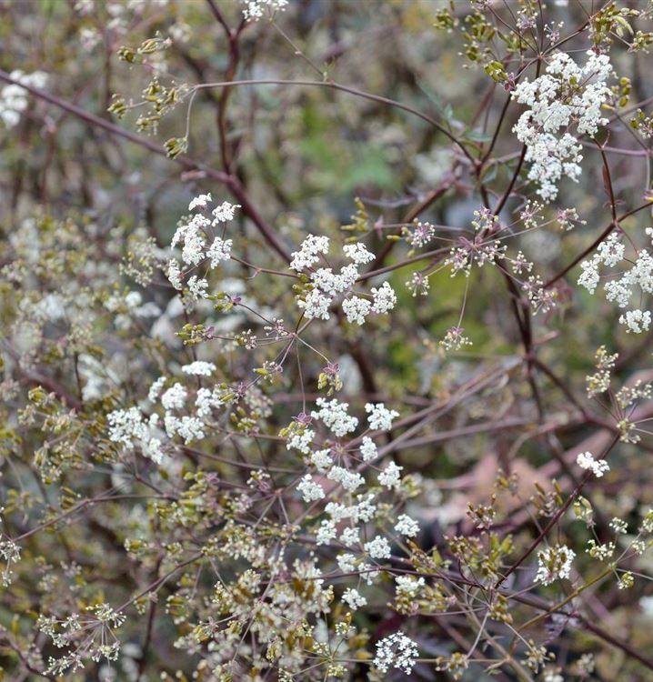 Die Blütezeit beginnt für den Wiesen-Kerbel 'Ravenswing' ab Juni. Dann trägt er Dolden mit, weissen Blüten. Bis Juli hält die Blüte an.