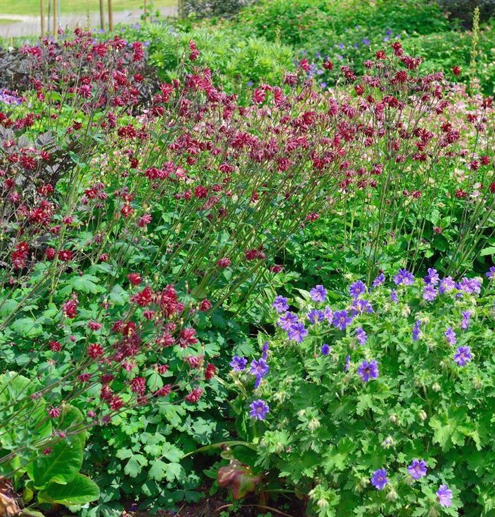 Pflanzenkombinationen machen sich immer besonders gut. Für die Nachbarschaft der Akelei 'Ruby Port' eignet sich zum Beispiel Gewöhnliches Maiglöckchen, Garten-Fingerhut und Grosse Sterndolde.
