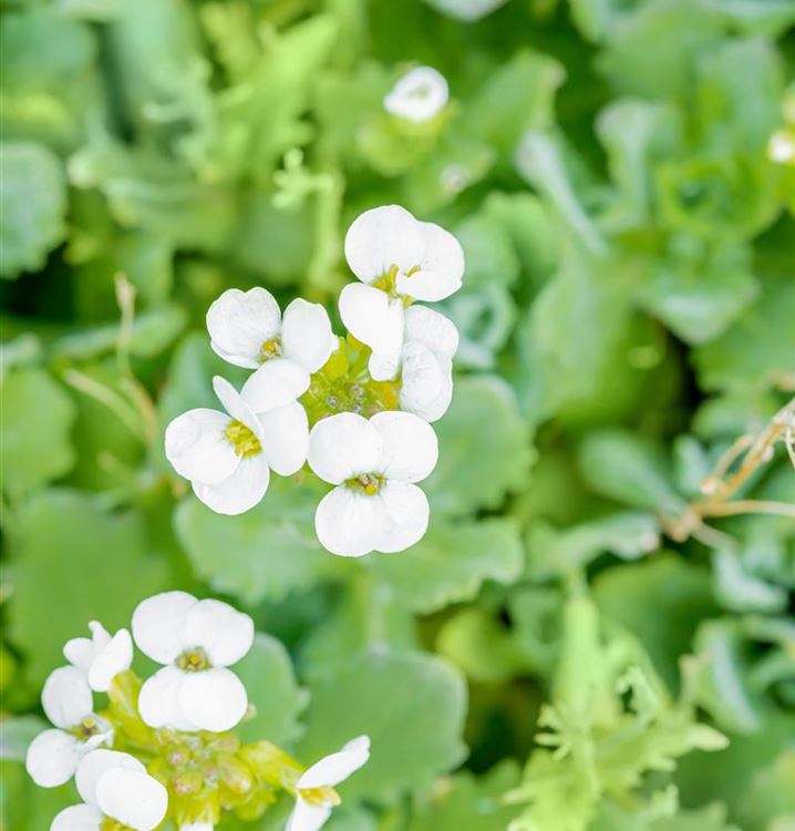 Stauden sind in der Gartengestaltung fast ein Muss, gibt es doch für nahezu jeden Standort die passenden Pflanzen. Die Garten-Gänsekresse 'Plena' (Arabis caucasica 'Plena') ist zum Beispiel eine hervorragende Steingartenpflanze und auch ein prima Bodendecker. Mit ihren radförmigen, gefüllten Blüten in Weiss ist die Garten-Gänsekresse 'Plena' von Mai bis Juni ein Blickfang. Dabei ist sie nicht nur eine Augenweide, denn ihre Blüten werden auch gerne von Bienen und anderen Insekten angeflogen. Ihre lanzettlichen Blätter tragen ebenso zu ihrer Wirkung bei. Sie sind grau-grün gefärbten. Da es sich um eine immergrüne Staude handelt, sorgen die Blätter auch im Winter für farbliche Akzente.
