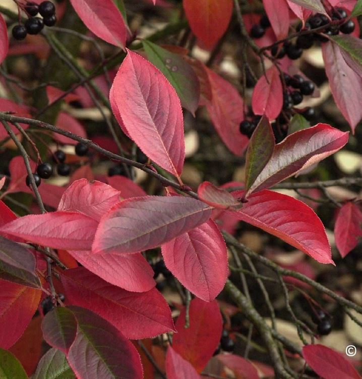 Dieser dekorative Zierstrauch zeichnet sich durch seine auffallende, rote Herbstfärbung und den schwarzvioletten Früchten aus.