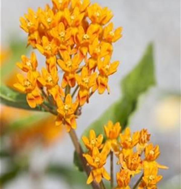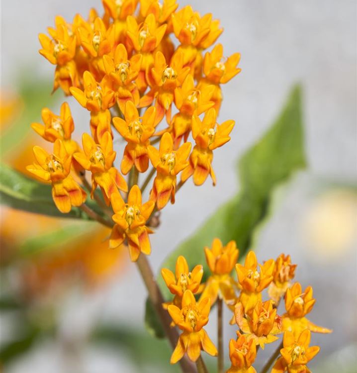 Die Blütezeit beginnt für die Knolligen Seidenpflanze ab Juni. Dann trägt sie Dolden mit sternförmigen, orangefarbenen Blüten. Noch dazu verströmen sie einen angenehmen Duft. Bis August hält die Blüte an.