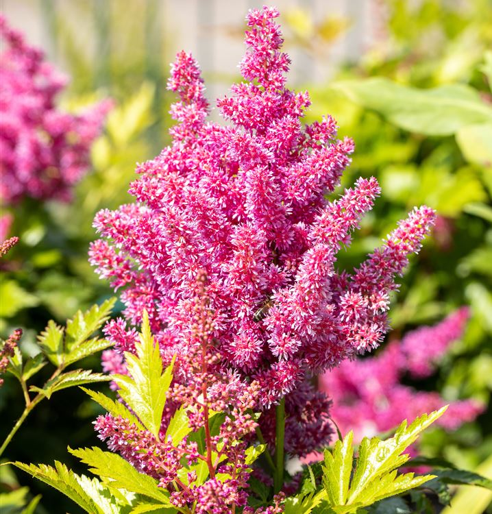 Stauden sind in der Gartengestaltung fast ein Muss, gibt es doch für nahezu jeden Standort die passenden Pflanzen. Die Garten-Prachtspiere 'Mainz' (Astilbe japonica 'Mainz') ist zum Beispiel eine hervorragende Steingartenpflanze, genauso wie sie in Blumenkübeln eine gute Figur macht. Mit ihren Blüten in Rosa ist die Garten-Prachtspiere 'Mainz' von Juni bis Juli ein Blickfang. Ihre gefiederten Blätter tragen ebenso zu ihrer Wirkung bei. Sie sind dunkelgrün gefärbten.