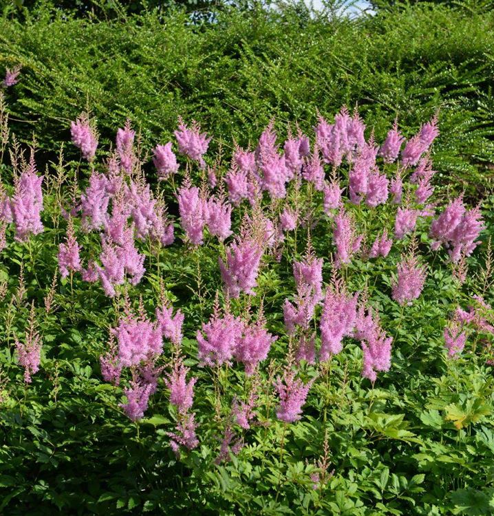 Pflanzenkombinationen machen sich immer besonders gut. Für die Nachbarschaft der Arends Garten-Prachtspiere 'Cattleya' eignet sich zum Beispiel Funkie, Japanisches Berggras und Hirschzungenfarn.