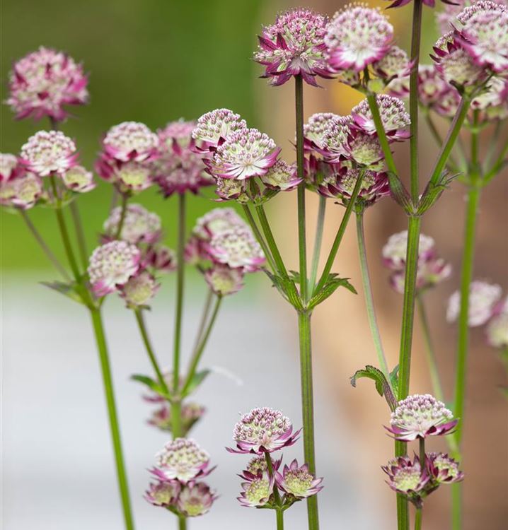 Die Blütezeit beginnt für die Garten-Sterndolde 'Abbey Road'® ab Juni. Dann trägt sie Dolden mit sternförmigen, purpurroten Blüten. Bis Juli hält die Blüte an und mit den richtigen Bedingungen ist im September mit einer zweiten Blüte zu rechnen.