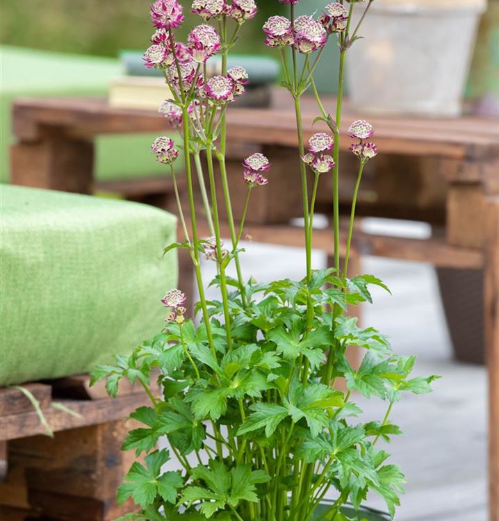 Stauden sind in der Gartengestaltung fast ein Muss, gibt es doch für nahezu jeden Standort die passenden Pflanzen. Mit ihren sternförmigen Blüten in Purpurrot ist die Garten-Sterndolde 'Abbey Road'® von Juni bis Juli ein Blickfang. Dabei ist sie nicht nur eine Augenweide, denn ihre Blüten werden auch gerne von Bienen und anderen Insekten angeflogen. Ihre handförmigen Blätter tragen ebenso zu ihrer Wirkung bei. Sie sind mittelgrün gefärbten.