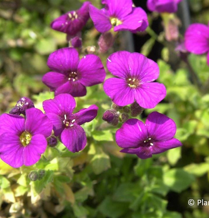 Das Garten-Blaukissen 'Bressingham Red' (Aubrieta x cultorum 'Bressingham Red') ist zum Beispiel eine hervorragende Steingartenpflanze, genauso wie es in Blumenkübeln eine gute Figur macht. Mit seinen radförmigen Blüten in Rot ist das Garten-Blaukissen 'Bressingham Red' von April bis Mai ein Blickfang. Doch es ist nicht nur eine Augenweide, denn die Blüten verbreitet auch noch einen leichten Duft und werden gerne von Bienen und anderen Insekten angeflogen. Seine eiförmigen Blätter tragen ebenso zu seiner Wirkung bei. Sie sind mittelgrün gefärbten. Da es sich um eine immergrüne Staude handelt, sorgen die Blätter auch im Winter für farbliche Akzente.