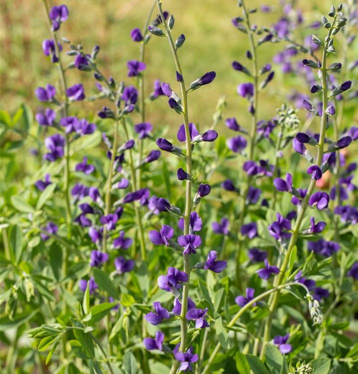 Pflanzenkombinationen machen sich immer besonders gut. Für die Nachbarschaft der Blauen Färberhülse eignet sich zum Beispiel Zartes Federgras und Wiesen-Salbei.