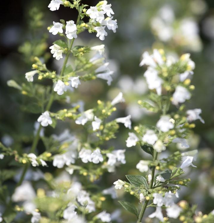 Stauden sind in der Gartengestaltung fast ein Muss, gibt es doch für nahezu jeden Standort die passenden Pflanzen. Die Kleinblütige Garten-Bergminze 'Weisser Riese' (Calamintha nepeta 'Weisser Riese') ist zum Beispiel eine hervorragende Steingartenpflanze. Mit ihren lippenförmigen Blüten in Weiss ist die Kleinblütige Garten-Bergminze 'Weisser Riese' von Juli bis September ein Blickfang. Doch sie ist nicht nur eine Augenweide, denn die Blüten verbreitet auch noch einen angenehmen Duft und werden gerne von Bienen und anderen Insekten angeflogen. Ihre glänzenden, eiförmigen, gesägten Blätter tragen ebenso zu ihrer Wirkung bei. Sie sind mittelgrün gefärbten.