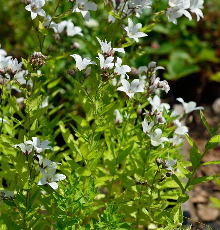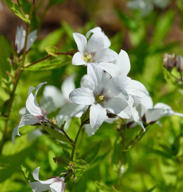 Stauden sind in der Gartengestaltung fast ein Muss, gibt es doch für nahezu jeden Standort die passenden Pflanzen. Mit ihren glockenförmigen Blüten in Weiss ist die Garten-Dolde-Glockenblume 'Alba' von Juni bis August ein Blickfang. Doch sie ist nicht nur eine Augenweide, denn die Blüten verbreitet auch noch einen angenehmen Duft und werden gerne von Bienen und anderen Insekten angeflogen. Ihre lanzettlichen Blätter tragen ebenso zu ihrer Wirkung bei. Sie sind mittelgrün gefärbten.