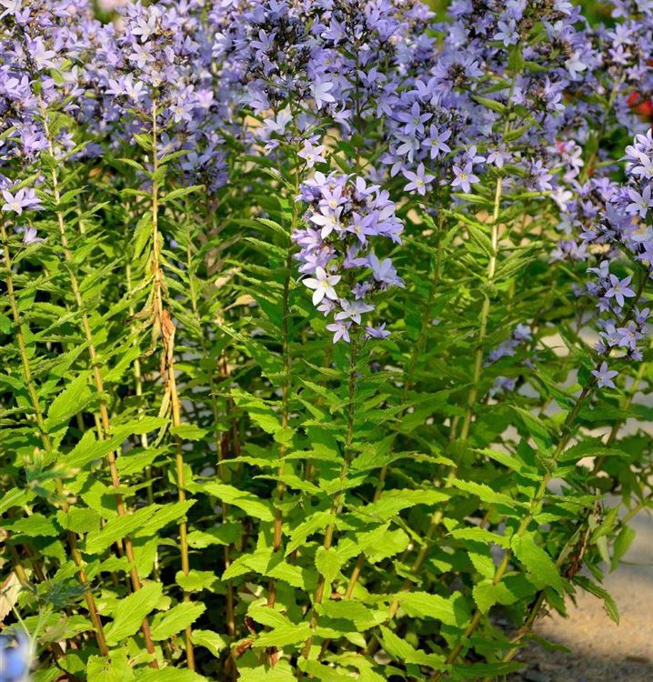 Stauden sind in der Gartengestaltung fast ein Muss, gibt es doch für nahezu jeden Standort die passenden Pflanzen. Mit ihren glockenförmigen Blüten in Hellrosa ist die Garten-Dolde-Glockenblume 'Loddon Anne' von Juni bis August ein Blickfang. Doch sie ist nicht nur eine Augenweide, denn die Blüten verbreitet auch noch einen angenehmen Duft und werden gerne von Bienen und anderen Insekten angeflogen. Ihre lanzettlichen Blätter tragen ebenso zu ihrer Wirkung bei. Sie sind mittelgrün gefärbten.