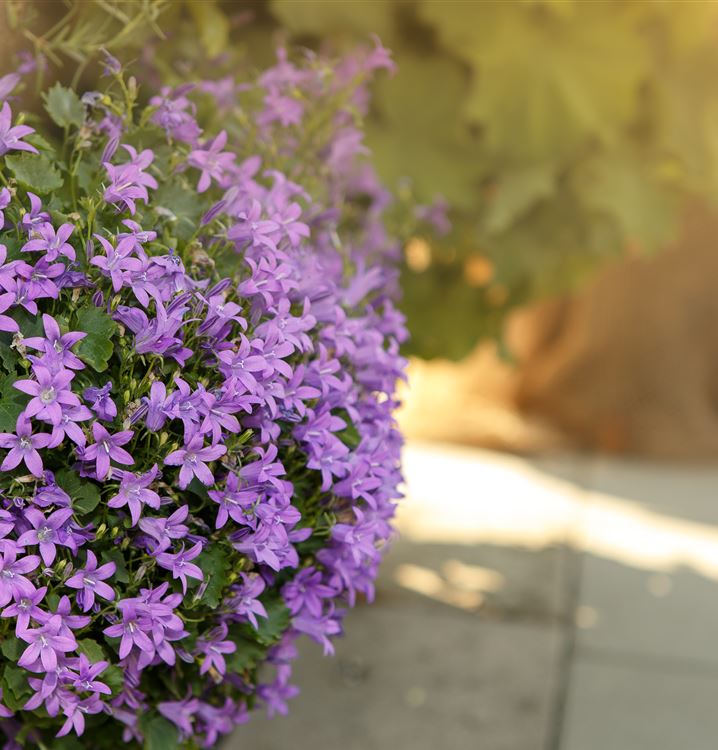 Pflanzenkombinationen machen sich immer besonders gut. Für die Nachbarschaft der Garten-Polster-Glockenblume 'Birch Hybrid' eignet sich zum Beispiel Fetthenne, Garten-Moos-Steinbrech und Purpurglöckchen.