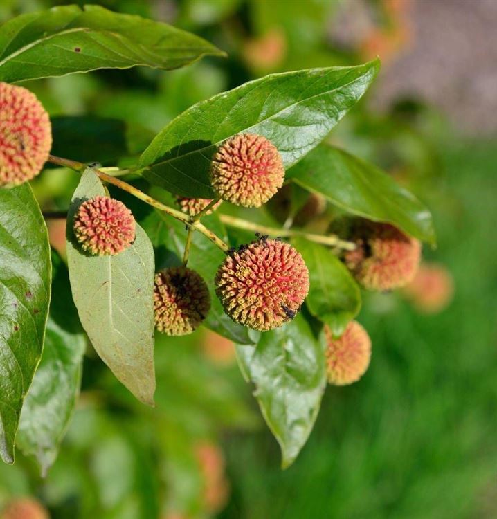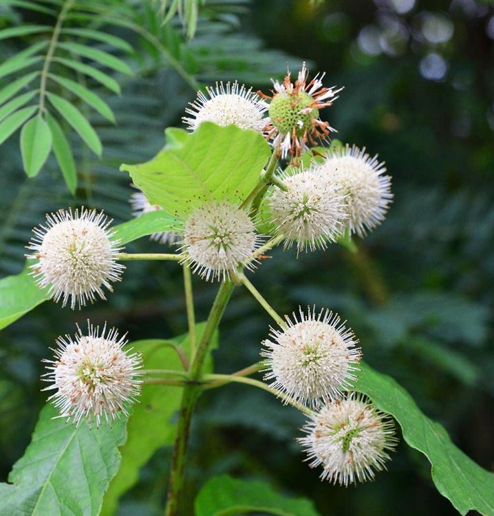 Der Knopfbusch (Cephalanthus occidentalis) ist ein Ziergehölz, das als Solitär eine besondere Wirkung erzielt. Seine glänzenden, lanzettlichen, ganzrandigen Blätter machen ihn unverwechselbar. Sie sind schön mittelgrün gefärbt. Im Herbst nehmen die sommergrünen Blätter orangegelbe Töne an. Seine ballförmigen Blüten, die er von Juli bis August trägt, sind cremeweiss. Übrigens sind die Blüten sehr beliebt bei Bienen und anderen Insekten.