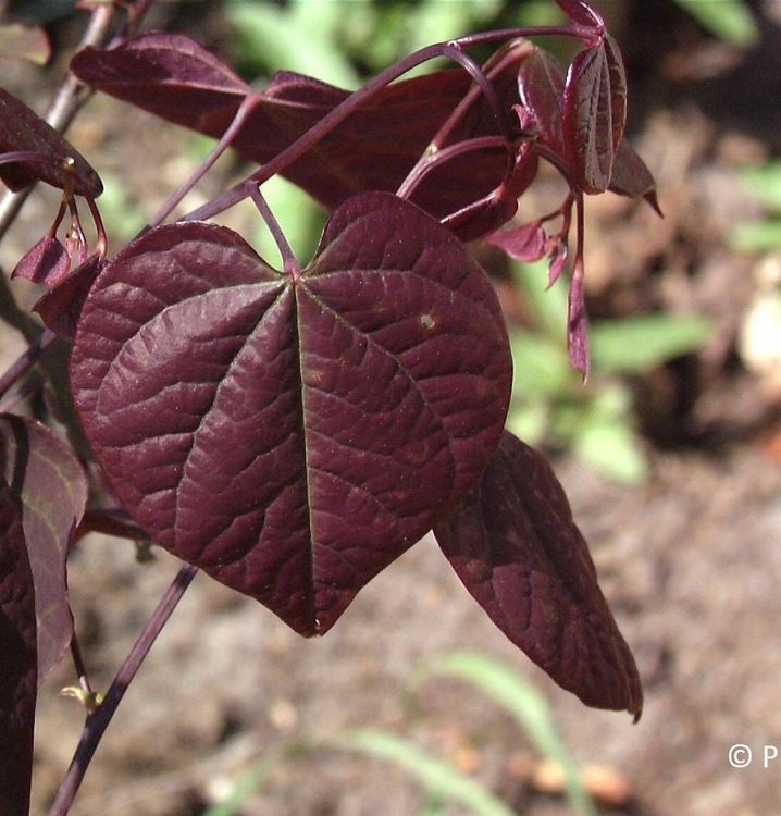 Nach einem Austrieb in Leuchtend rot nehmen die herzförmigen Blätter eine purpurrote Farbe an. Dabei sind sie etwa 8 cm bis 14 cm gross. Vor dem Laubfall nehmen sie schöne rot-braune Farbtöne an.