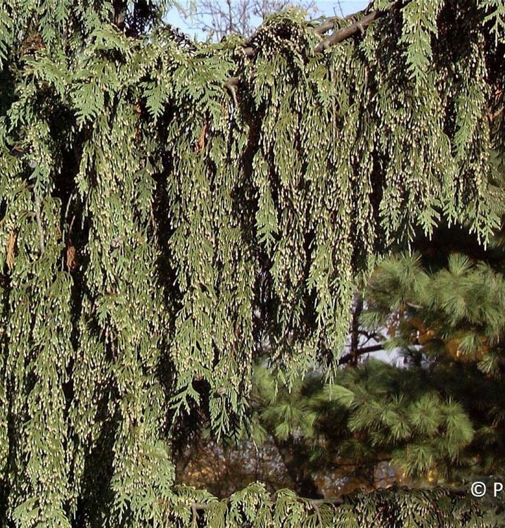 Die Nutka-Goldzypresse 'Pendula' (Chamaecyparis nootkatensis 'Pendula') ist ein dekoratives Ziergehölz, das im Einzelstand eine besondere Wirkung erzielt. Ihre schuppenförmigen Nadeln machen sie unverwechselbar. Sie sind schön dunkelgrün gefärbten. Da es sich um ein immergrünes Gehölz handelt, sorgen die Nadeln auch im Winter für farbliche Akzente. Diese Konifere trägt runde, braune Zapfen.