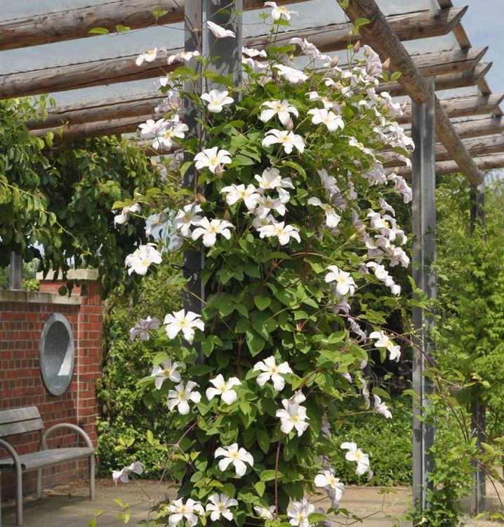 Pflanzenkombinationen machen sich immer besonders gut. Für die Nachbarschaft der Italienischen Waldrebe 'Huldine' eignet sich zum Beispiel Prachtspiere, Hoher Wald-Geissbart und Schildfarn.