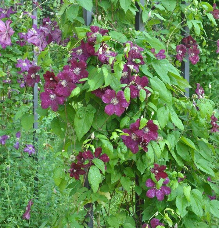 Pflanzenkombinationen machen sich immer besonders gut. Für die Nachbarschaft der Waldrebe 'Rouge Cardinal' eignet sich zum Beispiel Prachtspiere, Hoher Wald-Geissbart und Schildfarn.