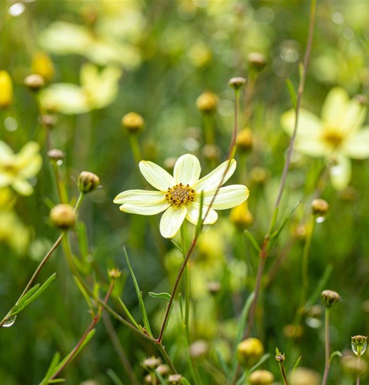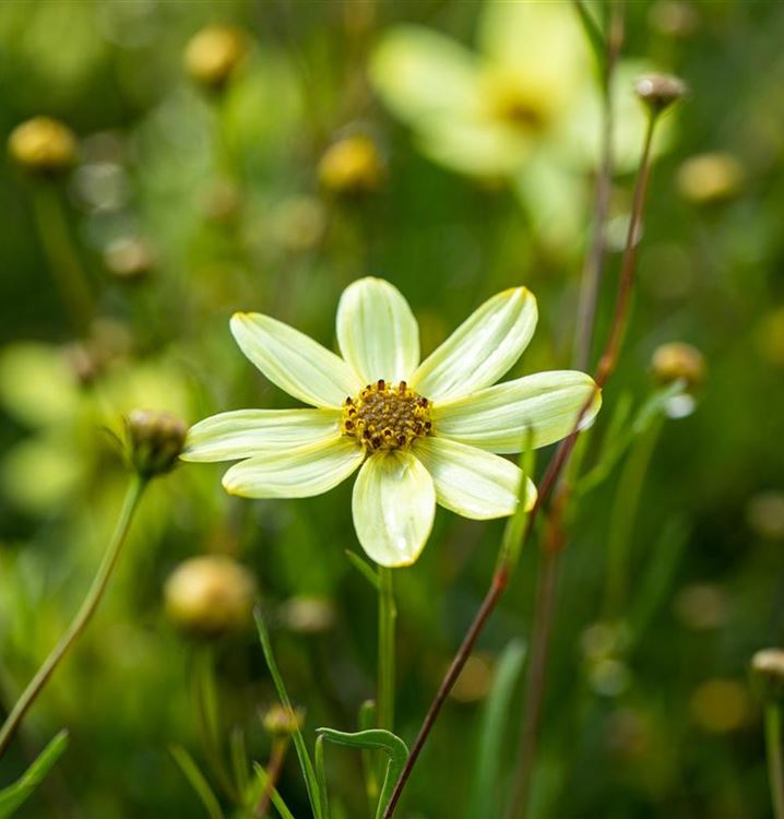 Stauden sind in der Gartengestaltung fast ein Muss, gibt es doch für nahezu jeden Standort die passenden Pflanzen. Das Mädchenauge 'Moonbeam' (Coreopsis verticillata 'Moonbeam') ist zum Beispiel eine hervorragende Steingartenpflanze, genauso wie es in Blumenkübeln eine gute Figur macht. Mit seinen strahlenförmigen Blüten in Zitronengelb ist das Mädchenauge 'Moonbeam' von Juni bis September ein Blickfang. Dabei ist es nicht nur eine Augenweide, denn seine Blüten werden auch gerne von Bienen und anderen Insekten angeflogen. Seine gefingerten Blätter tragen ebenso zu seiner Wirkung bei. Sie sind mittelgrün gefärbten.