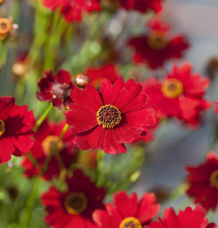 Stauden sind in der Gartengestaltung fast ein Muss, gibt es doch für nahezu jeden Standort die passenden Pflanzen. Das Quirlblättrige Garten-Mädchenauge 'Red Ruby' (Coreopsis verticillata 'Red Ruby') ist zum Beispiel eine hervorragende Steingartenpflanze, genauso wie es in Blumenkübeln eine gute Figur macht. Mit seinen strahlenförmigen Blüten in Rot ist das Quirlblättrige Garten-Mädchenauge 'Red Ruby' von Juni bis September ein Blickfang. Dabei ist es nicht nur eine Augenweide, denn seine Blüten werden auch gerne von Bienen und anderen Insekten angeflogen. Seine gefingerten Blätter tragen ebenso zu seiner Wirkung bei. Sie sind mittelgrün gefärbten.