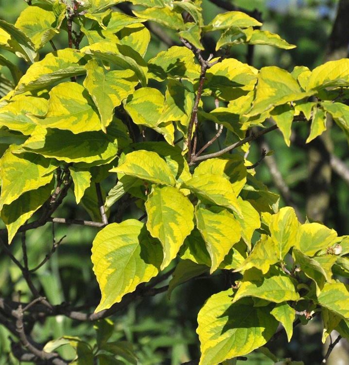 Als Ziergehölz macht der Amerikanische Blumen-Hartriegel 'Rainbow' (Cornus florida 'Rainbow') immer eine gute Figur in der Gartengestaltung. Seine lanzettlichen, gewellten Blätter machen ihn unverwechselbar. Sie sind schön grün gefärbt und mit einem gelben Rand gezeichnet. Im Herbst nehmen die sommergrünen Blätter orangegelbe bis orange-rote Töne an. Seine Blüten, die er von Mai bis Juni trägt, sind weiss.