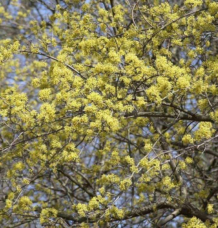 Die Blütezeit beginnt für die Kornelkirsche ab März. Dann trägt sie Dolden mit, goldgelben Blüten. Noch dazu verströmen sie einen leichten Duft. Bis April hält die Blüte an.
