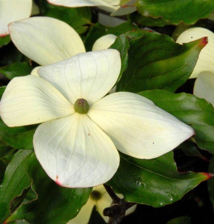 Als Ziergehölz macht der Japanische Blumen-Hartriegel 'Venus'® (Cornus kousa 'Venus'®) immer eine gute Figur in der Gartengestaltung. Seine eiförmigen, gewellten Blätter machen ihn unverwechselbar. Sie sind schön mittelgrün gefärbt. Im Herbst nehmen die sommergrünen Blätter scharlachrote Töne an. Seine Blüten, die er von Mai bis Juni trägt, sind weiss.