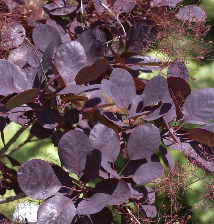 Der Rote Perückenstrauch 'Royal Purple' (Cotinus coggygria 'Royal Purple') ist nicht nur eine Bereicherung in der Gartengestaltung, er eignet sich auch bestens als Kübelpflanze für Balkon oder Terrasse. Seine glänzenden, eiförmigen Blätter machen ihn unverwechselbar. Sie sind schön schwarz-rot gefärbt. Im Herbst nehmen die sommergrünen Blätter scharlachrote Töne an. Seine Blüten, die er von Juni bis Juli trägt, sind rot-braun. Ab August trägt er silbergraue Früchte, die sehr dekorativ wirken.
