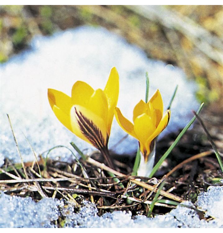Die Blütezeit beginnt für den Krokus ab Januar. Dann trägt er trichterförmige, goldgelbe Blüten. Bis Februar hält die Blüte an.