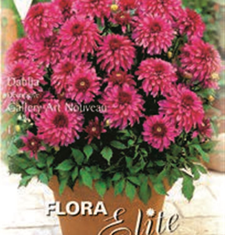 Die Blütezeit beginnt für die Dekorativen Dahlie 'Gallery Art Nouveau' ab Juli. Dann trägt sie körbchenartige, dunkelrosafarbene Blüten. Bis Oktober hält die Blüte an.