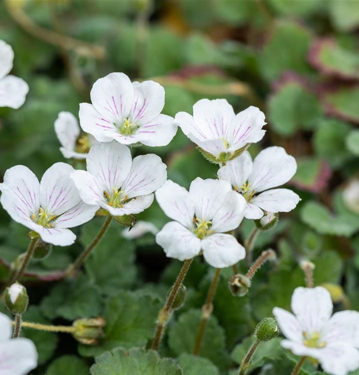 Der Reiherschnabel 'Album' ist eine hervorragende Steingartenpflanze. Mit seinen schalenförmigen Blüten in Weiss ist er von Mai bis September ein echter Blickfang. Seine rundlichen Blätter tragen ebenso zu seiner Wirkung bei. Sie sind mittelgrün gefärbten. Da es sich um eine wintergrüne Staude handelt, sorgen die Blätter auch im Winter für farbliche Akzente.