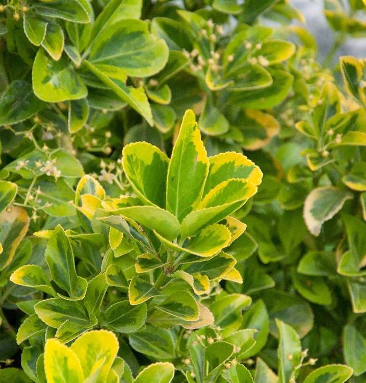 Die Gelbbunte Japanspindel 'Aureomarginatus' (Euonymus japonicus 'Aureomarginatus') ist ein wunderbares, interessantes Gehölz. Ihre eiförmigen, gesägten Blätter machen sie unverwechselbar. Sie sind schön grün gefärbt und mit einem gelben Rand gezeichnet. Da es sich um ein immergrünes Gehölz handelt, sorgen die Blätter auch im Winter für farbliche Akzente.