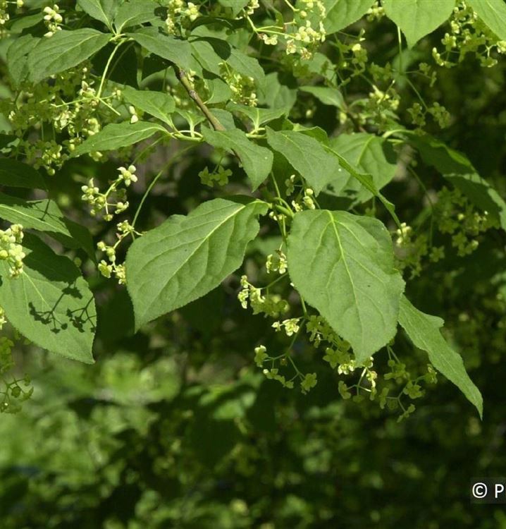 Die Blütezeit beginnt für das Grossfrüchtigen Pfaffenhütchen ab Mai. Dann trägt es grüngelbe Blüten.