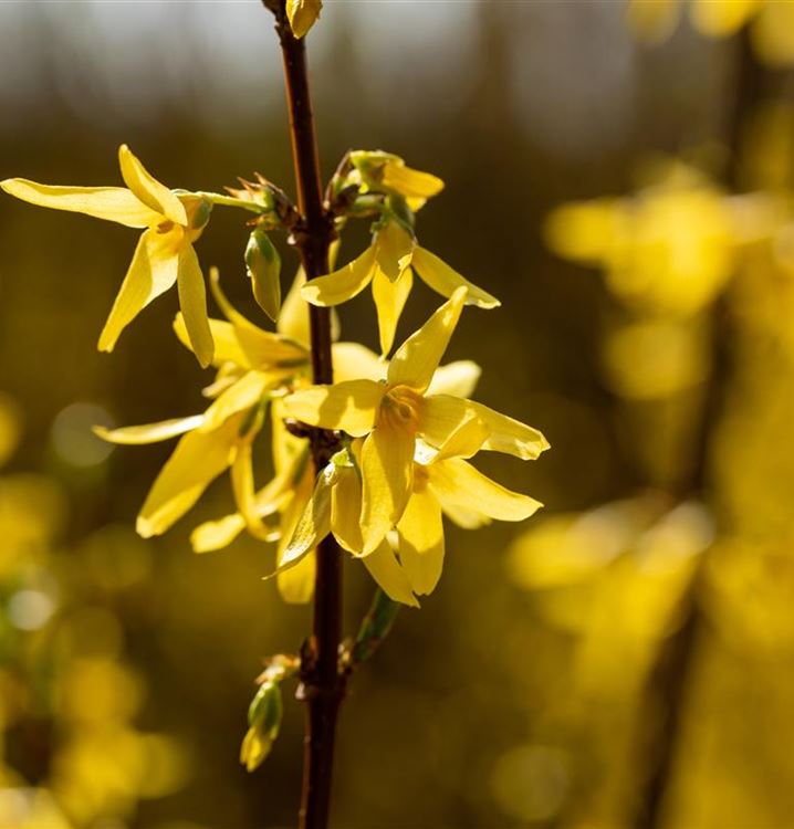In durchlässiger und nährstoffreicher Erde an einem sonnigen bis halbschattigen Platz entwickelt sich die Forsythie 'Spectabilis' zu einem schönen, überhängenden, malerischen Strauch von bis zu 3 m Höhe und 3 m Breite.
